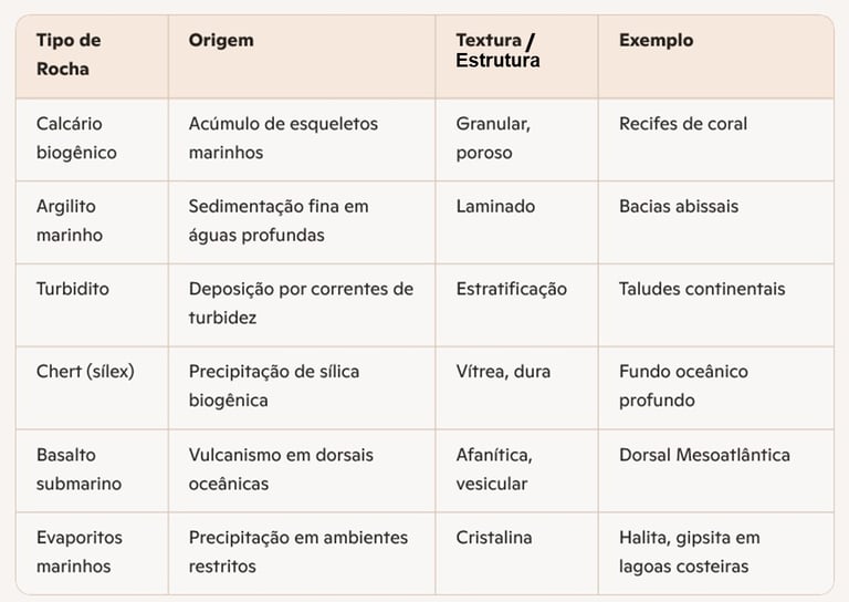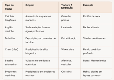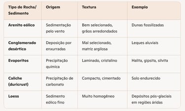 Rochas comuns: Arenitos e depósitos evaporíticos (sal-gema, gipsita).
