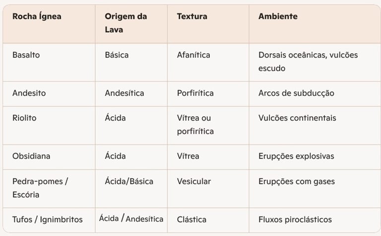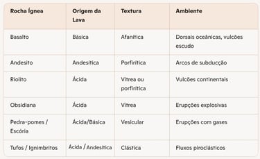 Rochas geradas: Rochas ígneas extrusivas como basalto, andesito e riolito.