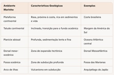 Características: Inclui plataformas continentais, taludes e bacias oceânicas.