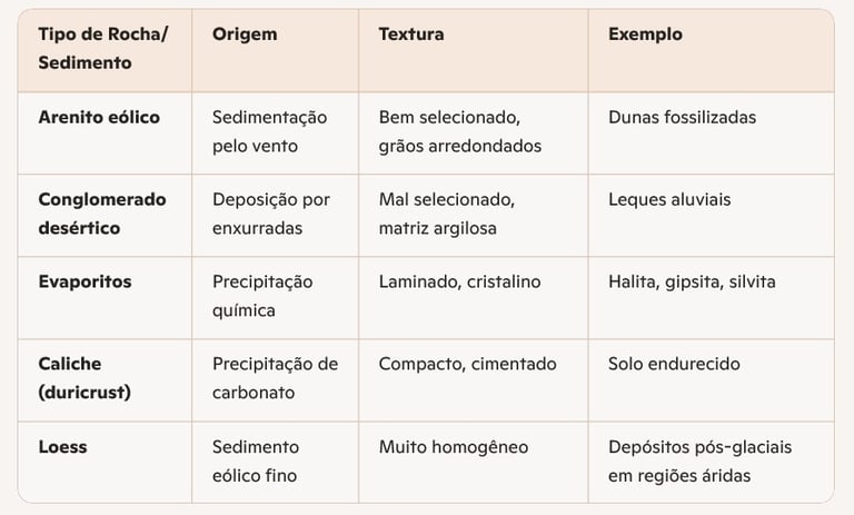 Rochas geradas: Arenito, conglomerado e depósitos evaporíticos (gipsita, halita).
