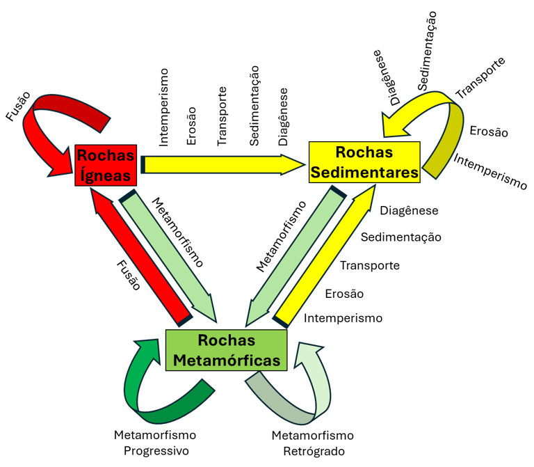 O ciclo das rochas é o principal mecanismo que conecta os ambientes geológicos. Ele mostra como uma rocha pode se transformar em outra, dependendo das condições ambientais: