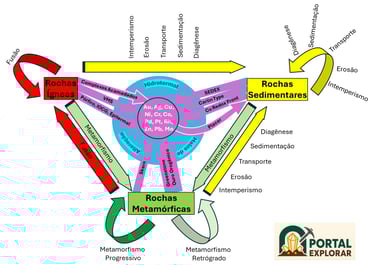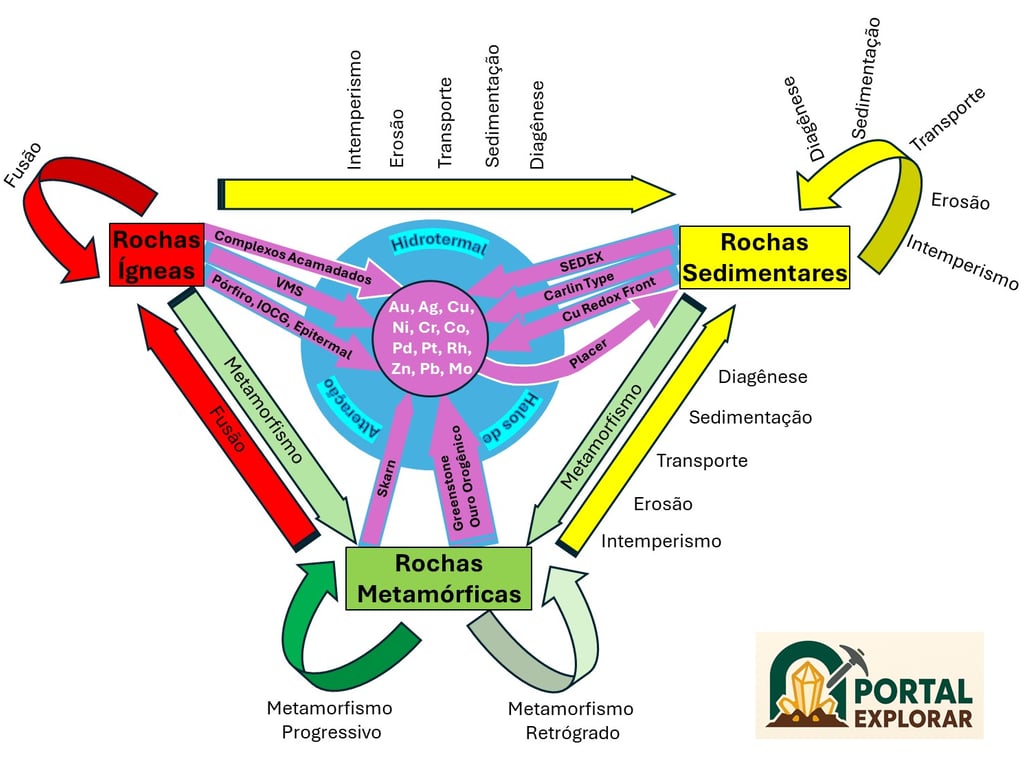 Além disso, o diagrama destaca, de forma clara e simplificada, como cada classe de rocha — ígnea, sedimentar e metamórfica — pode estar associado à formação de diversos depósitos minerais economicamente relevantes, como ouro (Au), prata (Ag), cobre (Cu), níquel (Ni), cromo (Cr), cobalto (Co), paládio (Pd), platina (Pt), ródio (Rh), zinco (Zn), chumbo (Pb), molibdênio (Mo), entre outros.