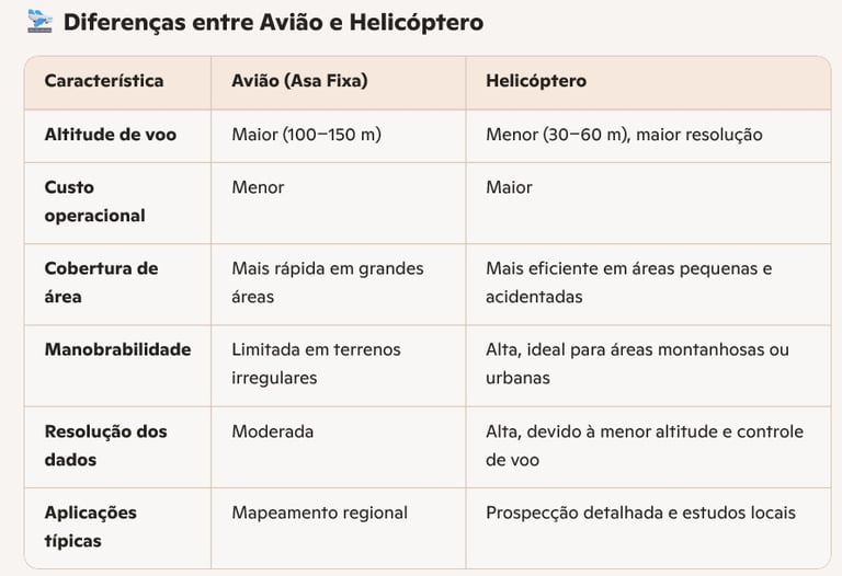 Realizados por aeronaves equipados com sensores geofísicos, cobrindo grandes áreas com rapidez e eficiência.