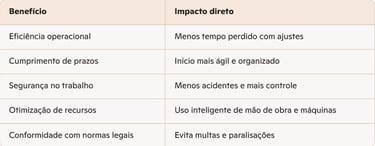 Evita atrasos e desperdícios ao garantir que tudo esteja pronto e funcionando desde o início do projeto.Documentação e conformidade legal