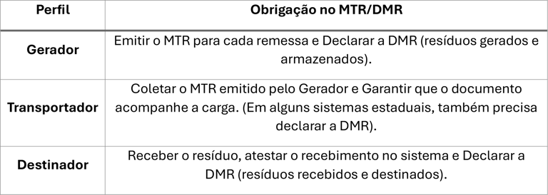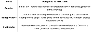 Documento Único: O MTR deve acompanhar o transporte do resíduo, sendo exigido em fiscalizações nas rodovias ou nas instalações.