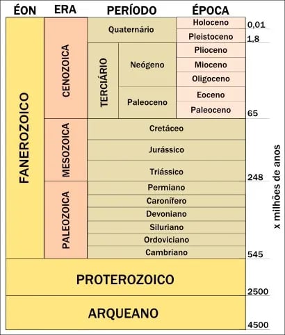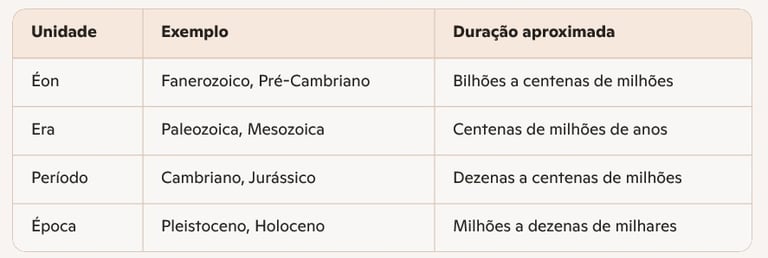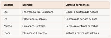 A escala do tempo geológico é dividida em grandes unidades hierárquicas: