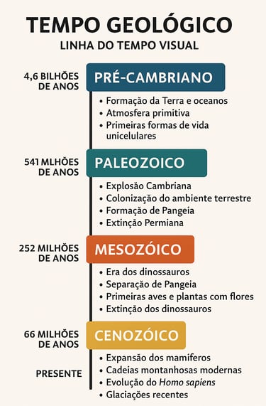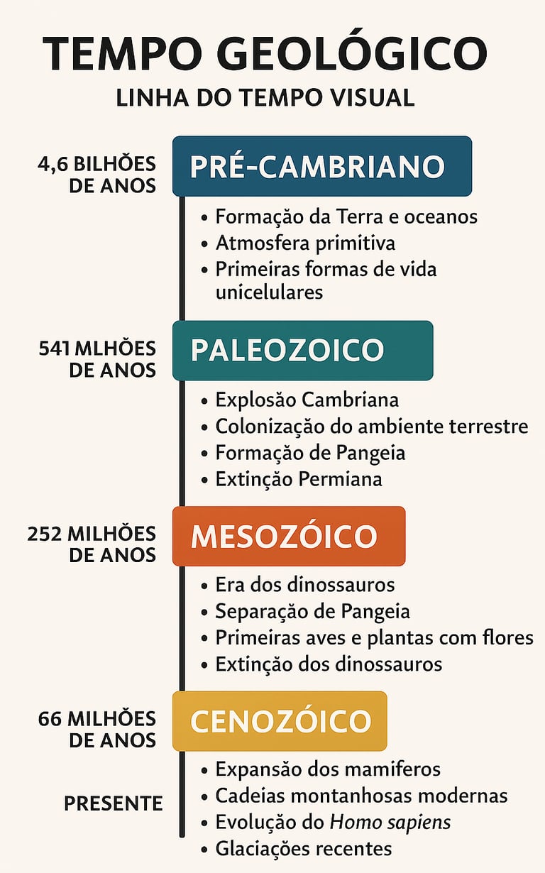 Cada era geológica representa um capítulo da história da vida, com adaptações, conquistas ecológicas e desafios ambientais.