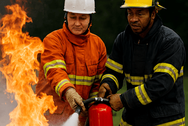 Identificação de riscos, o uso de equipamentos de combate a incêndio, procedimentos de evacuação segura e primeiros socorros.