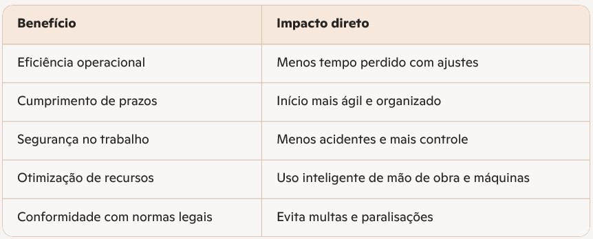 É nesse momento que se alinham os profissionais capacitados e os protocolos de segurança. Uma mobilização estruturada permite que o projeto comece com clareza, controle e agilidade, criando as bases para cumprir prazos, manter a qualidade e garantir a segurança de todos os envolvidos.