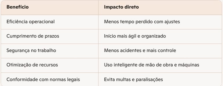 Evita atrasos e desperdícios ao garantir que tudo esteja pronto e funcionando desde o início do projeto.Documentação e conformidade legal